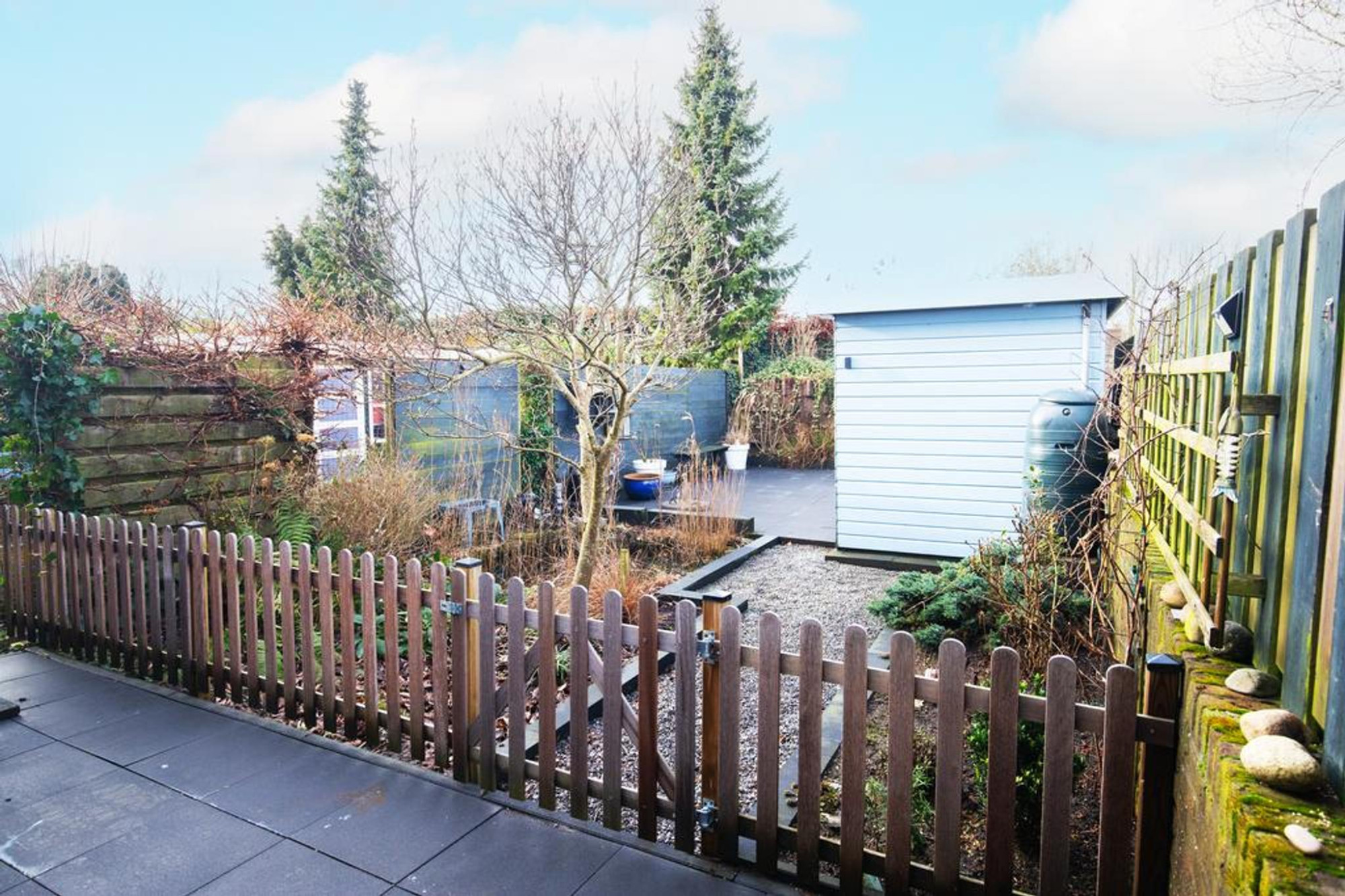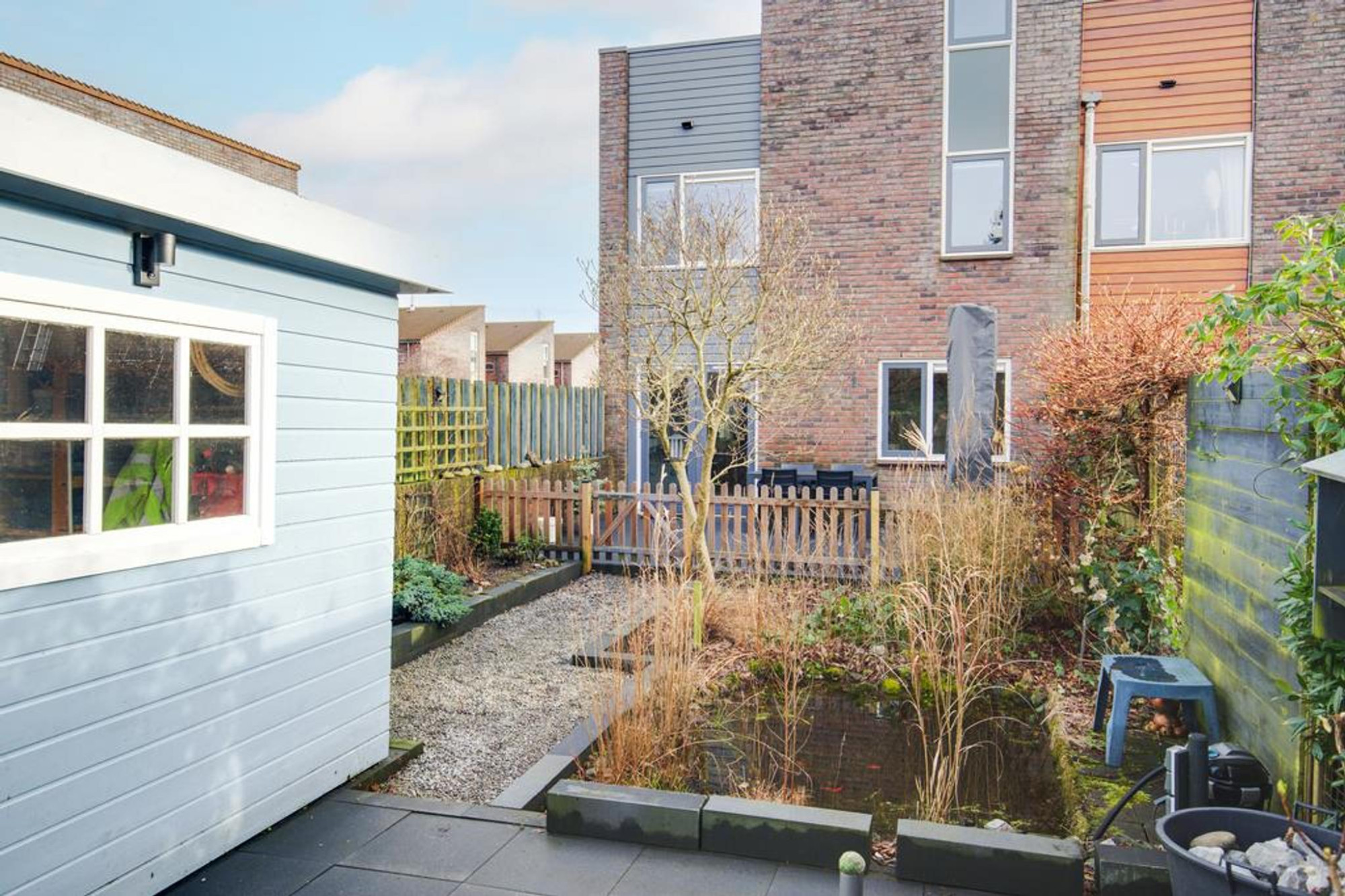 De tuin is fraai aangelegd en voorzien van een terras, borders, een vijver en een houten berging. De voortuin is volledig voorzien van tegels en ruimte voor een auto. Via hier is ook de inpandige garage middels dubbele deuren te bereiken.