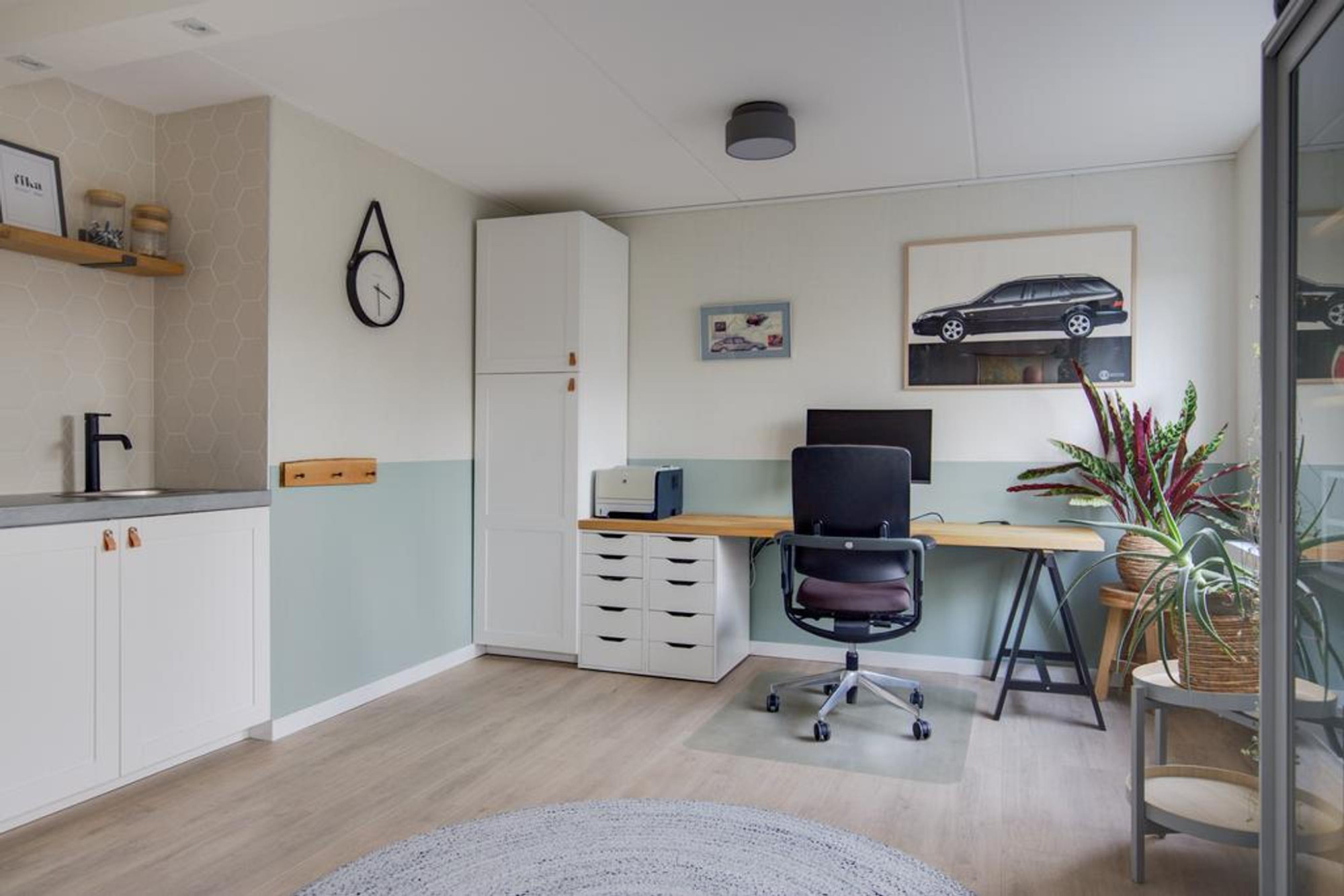 Via de nette voortuin met parkeergelegenheid op eigen terrein bereikt u de entree. Vanuit daar bereikt u de hal waarbij u aan uw linkerhand de ingang naar de garage heeft waar zich ook de wasmachine- en drogeropstelling bevindt. Aan uw rechterhand treft u het toilet met fonteintje. Als u door de tussendeur loopt bereikt u een zeer ruime en lichte hal met een groot raampartij. Eenmaal verder gelopen komt u in de tuin/werkkamer, voorzien van een extra keukenblok. Deze ruimte kunt u, indien gewenst, eenvoudig als derde slaapkamer inrichten. Door de openslaande deuren bereikt u de fraaie tuin met ligging op het Noordwesten.